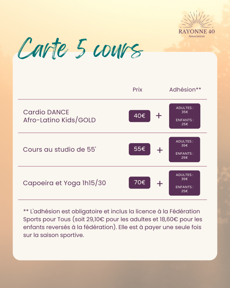 | CARDIO DANCE : | 105 € (au lieu de 175€) |